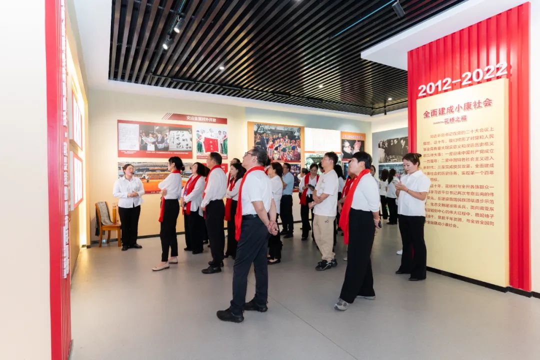 在花桥村党史馆,全体人员跟随专业解说员的脚步,沉浸于一段段波澜壮阔的奋斗史中。一件件饱含沧桑的实物展品、一幅幅定格历史的珍贵照片、一幕幕生动再现的场景,无声讲述着花桥村人民在中国共产党领导下投身革命洪流、建设家园、迈向新时代的壮丽征程。解说员深情讲述的本地红色故事,让那段艰苦卓绝又充满信仰光芒的岁月变得触手可及,使同志们对脚下这片热土所承载的革命传统有了更深切的感悟。